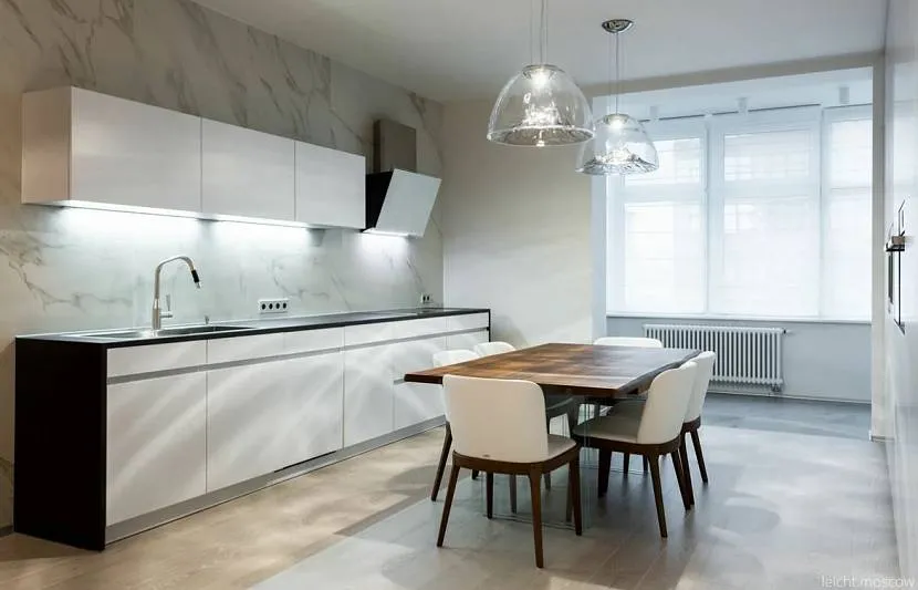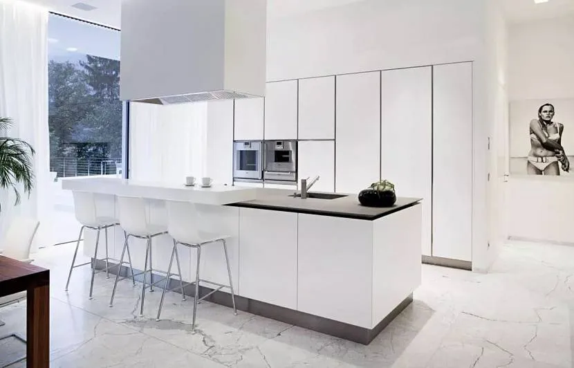 В отличие от предыдущих вариантов, модерн в белой кухне подразумевает наличие глянца. Сразу после входа в помещение должно создаться впечатление обилия естественного освещения. Достигается это следующим образом: