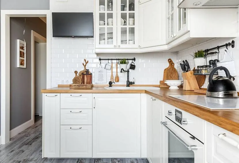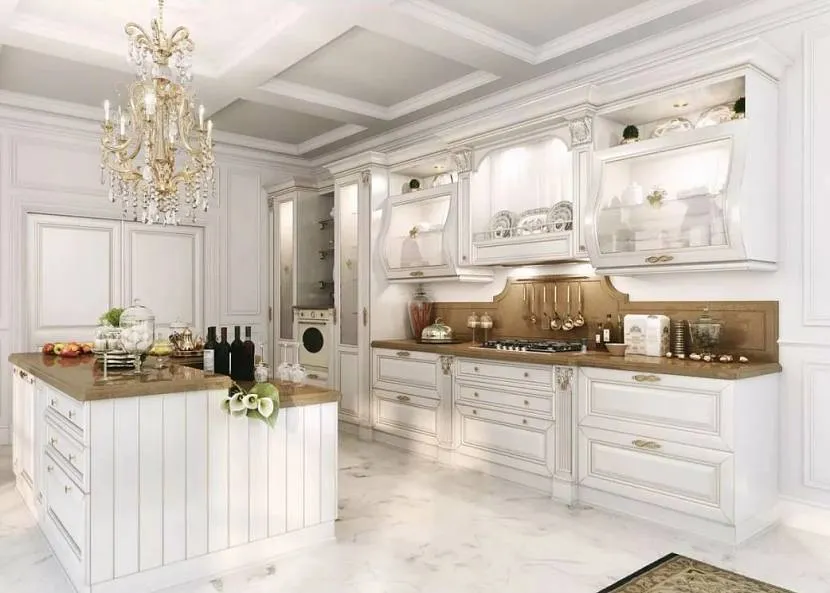Приверженность к классическому стилю остаётся неизменной на протяжении нескольких десятилетий. Интерьер белой кухни с деревянной столешницей, выдержанный в светлых тонах с присутствием многоцветных композиций, останется популярным надолго. Для его создания потребуется соблюдение ряда условностей: