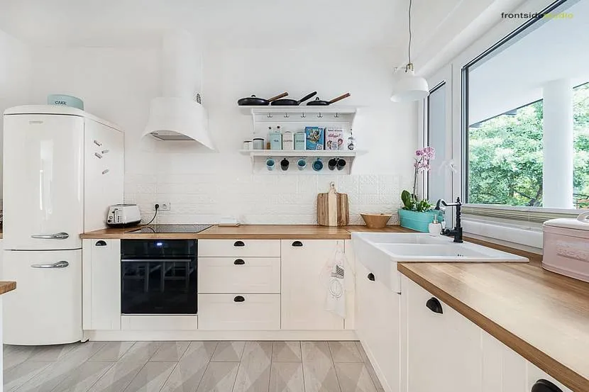 В таких интерьерах белый тон играет ключевую роль. Отличным результатом станет его использование не только в элементах кухонного гарнитура, но и в облицовочных материалах стен. Усиление эффекта осуществляется за счёт ярких вкраплений. Например, фартука с лиственным или цветочным узором.