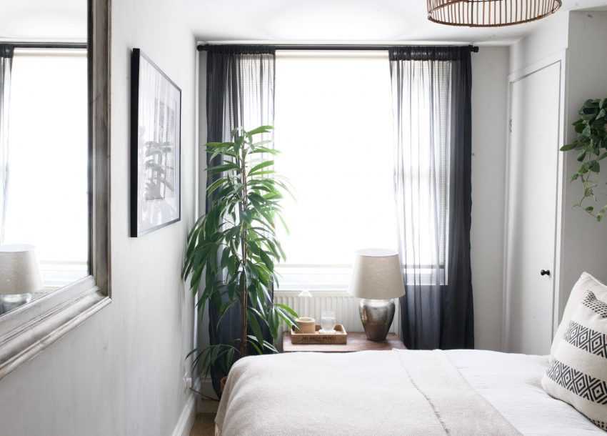 Окно, как правило, украшают легкой светлой тканью из синтетических материалов. Римские или рулонные шторы, легкий тюль и жалюзи являются самым распространенным выбором для небольшой спальни.