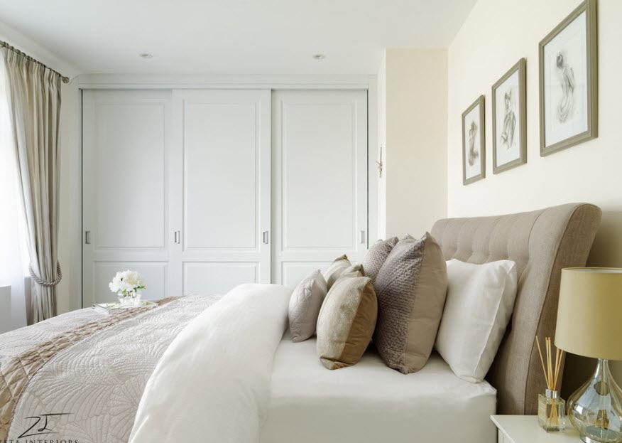 Самым нейтральным, пожалуй, можно считать белый цвет. Даже если он будет третьим цветом в оформлении спальни, он не будет обращать на себя слишком много внимания. Поэтому белый потолок, белый тюль или белое постельное белье применимы в любом интерьере.