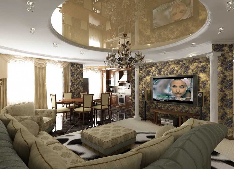Интерьер гостиной в классическом стиле предполагает обилие света. Обязательно должна присутствовать большая массивная люстра с подвесками из хрусталя или декоративного стекла. Как правило, это изделия, корпус которых имеет плавные изогнутые линии. Классические люстры правильной круглой формы, тяжёлые, снабжены множеством мелких деталей.