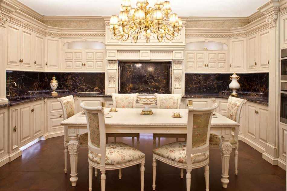 В классическом стиле кухня, как правило, всегда объединена со столовой и гостиной.