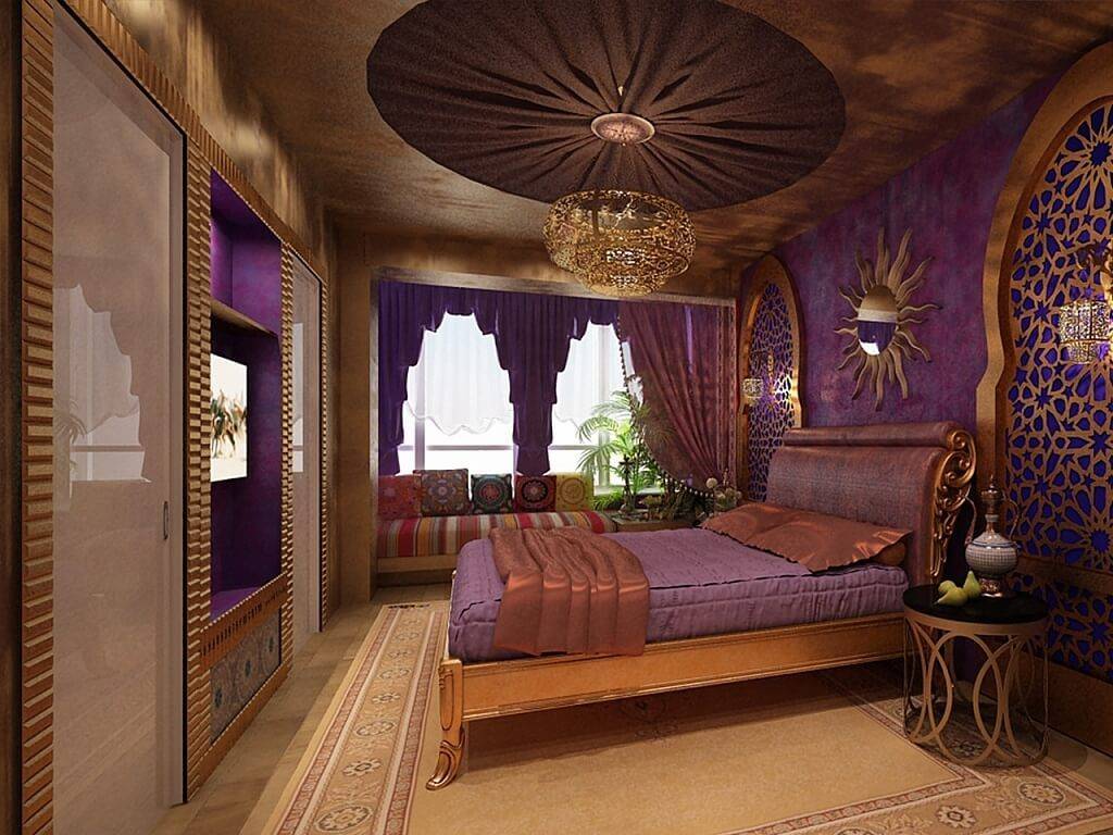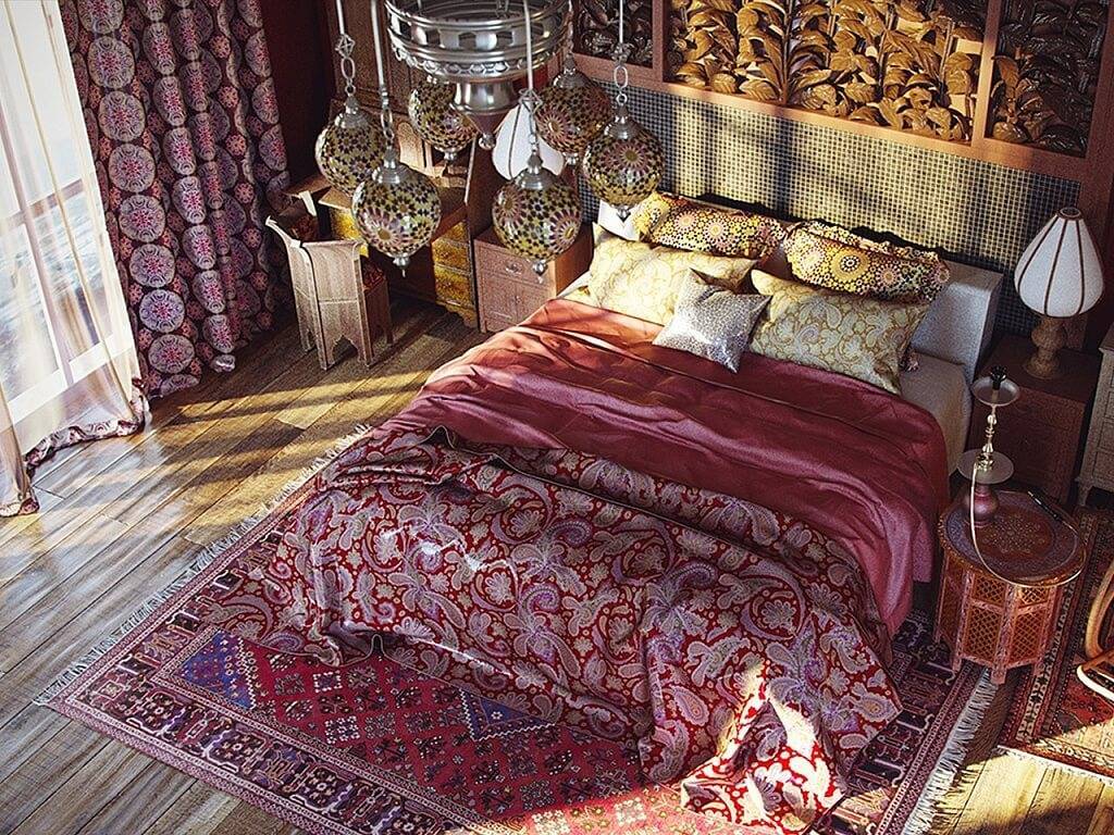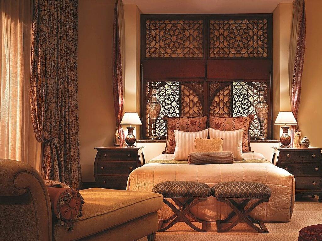 В арабских комнатах запрещено иметь изображения живых существ и растений. Здесь нельзя увидеть статуэтки зверей. В качестве аксессуаров для спальни используются металлические блюда и другая посуда.