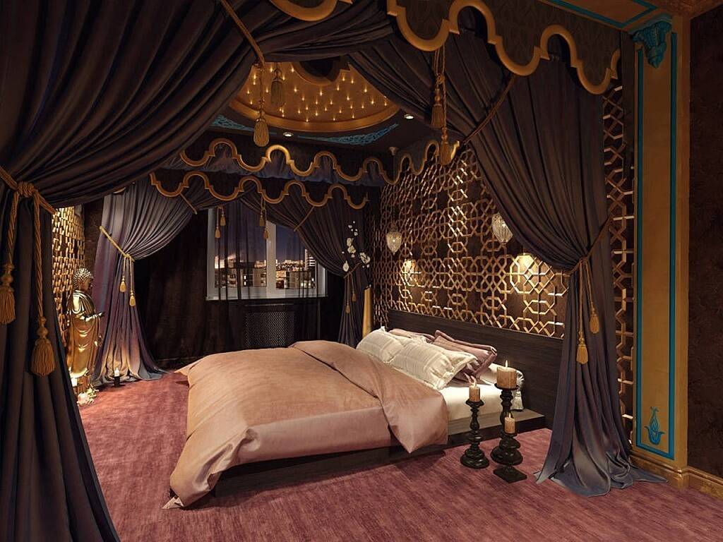 Многослойные шторы создают сказочную таинственную атмосферу и придают оконному проёму любую форму. Плавные линии у окна повторяются в прикроватной зоне. Балдахин является классикой для арабской спальни.