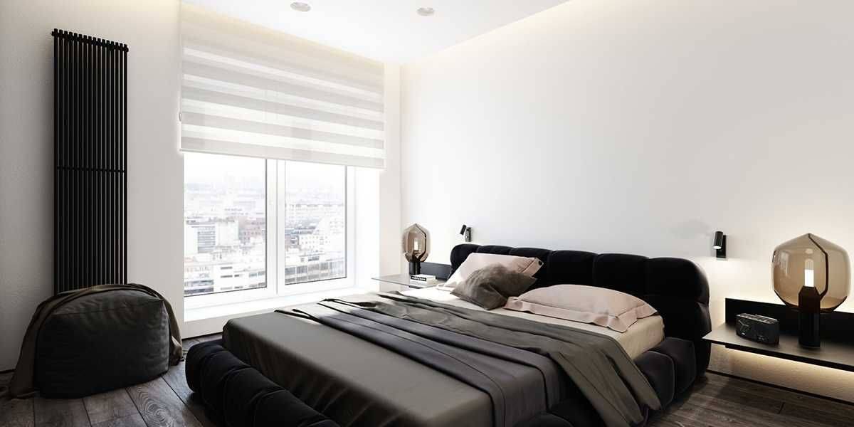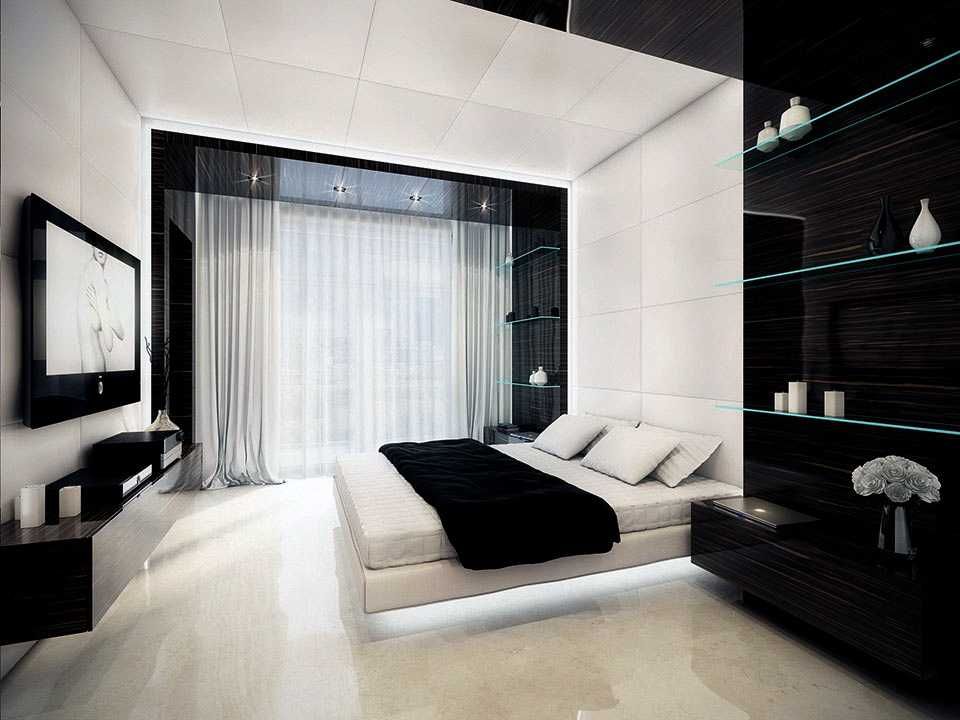 Сочетание белого и черного цветов универсально, поэтому такую спальню можно оформить в любом стиле: