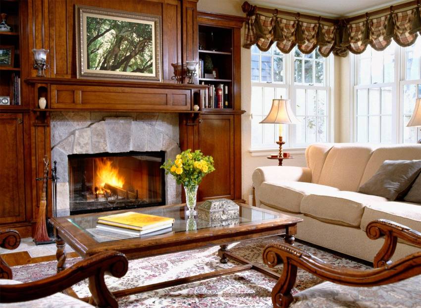 На полу может быть однотонная шкура животного с густой высокой шерстью или пёстрая шкура быка, зебры. Потолок из широких досок, может быть с массивными деревянными балками, выделенными цветом. И обязательно камин — если не настоящий, то уж точно электрический.