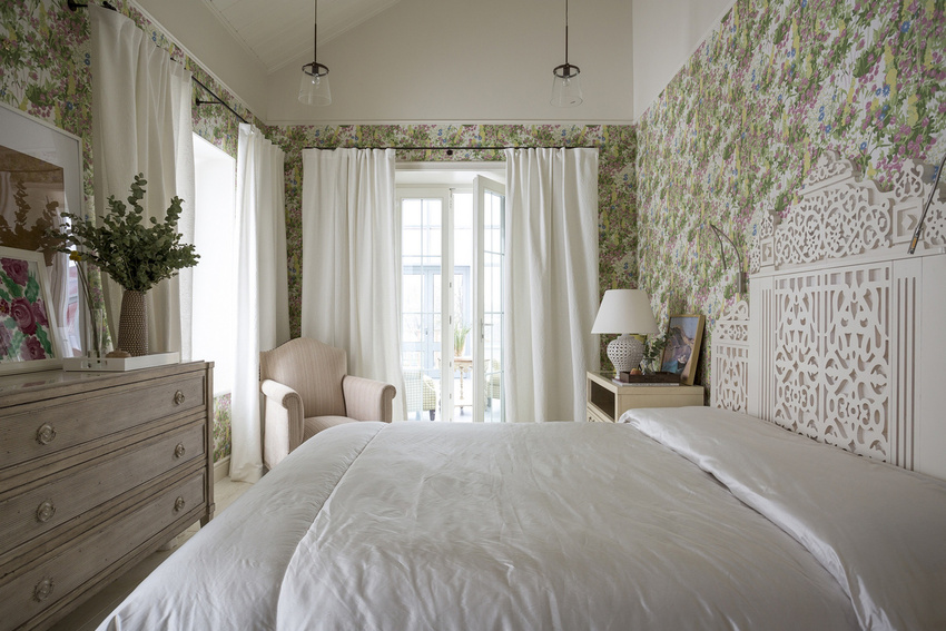 Центром помещения, оформленного в любом варианте деревенского стиля, должна быть кровать. В отличие от классики или неоклассики она должна иметь высокое изголовье без излишних украшений. Кроме того, приветствуется обивка, выполненная из ткани в цветочек.