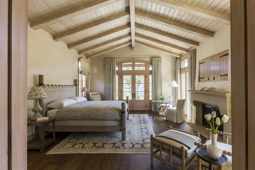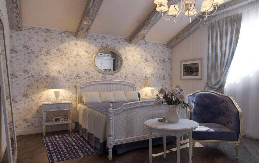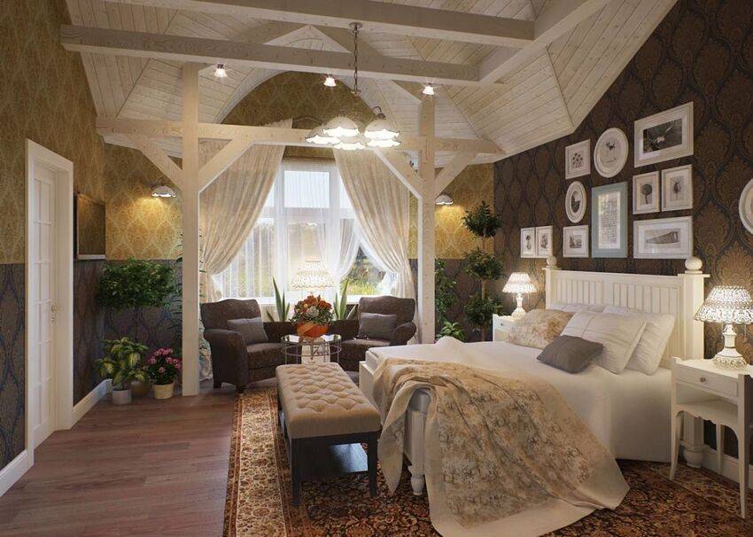 Нужно серьезно отнестись к оформлению всех поверхностей: от пола до потолка. Даже мебель должна быть изготовлена из определенного материала. Спальня может находиться под крышей или на мансарде. В этом случае не стоит закрывать балки, можно их просто покрыть лаком.