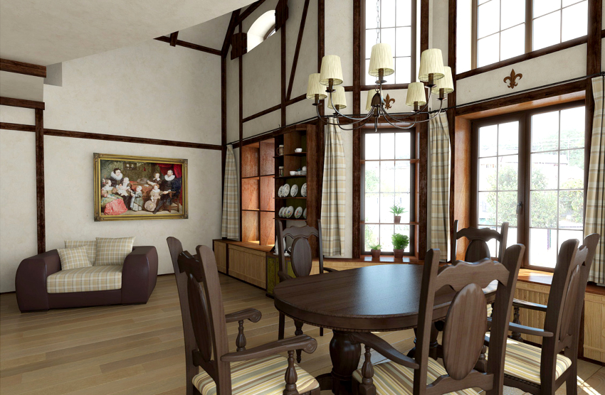 В обязательном порядке при отделке вне зависимости от стилевых ответвлений пол, основные элементы потолка и стен, аксессуары должны быть выполнены из дерева. Окна также стоит оформить деревянными рамами, а откосы и подоконник выбрать такими, чтобы они отражали дух деревенского стиля.