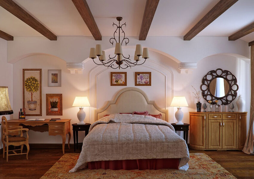 В спальне обязательно много мебели в деревенском стиле. Это разные мелочи, которые «бросаются в глаза» и помогают создать интимную обстановку. В сеттинге обязательно присутствуют следующие вещи: