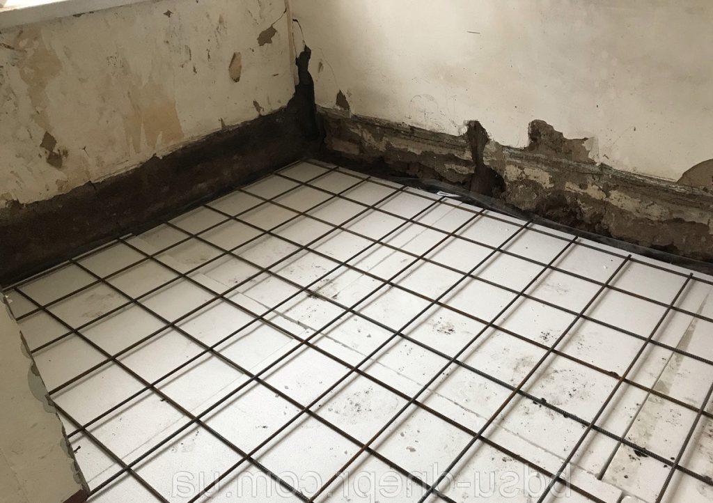 Для проведения армирования заливают небольшой слой бетона (3-5 см). На него раскладывают плоскую сварную сетку с ячеей 10-15 см. Толщина прутка составляет не менее 3 мм.