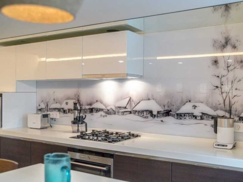 Нельзя не отметить то, что стеклянный фартук можно сделать настолько оригинальным, что ни в одной кухне мира вы не найдёте аналога.