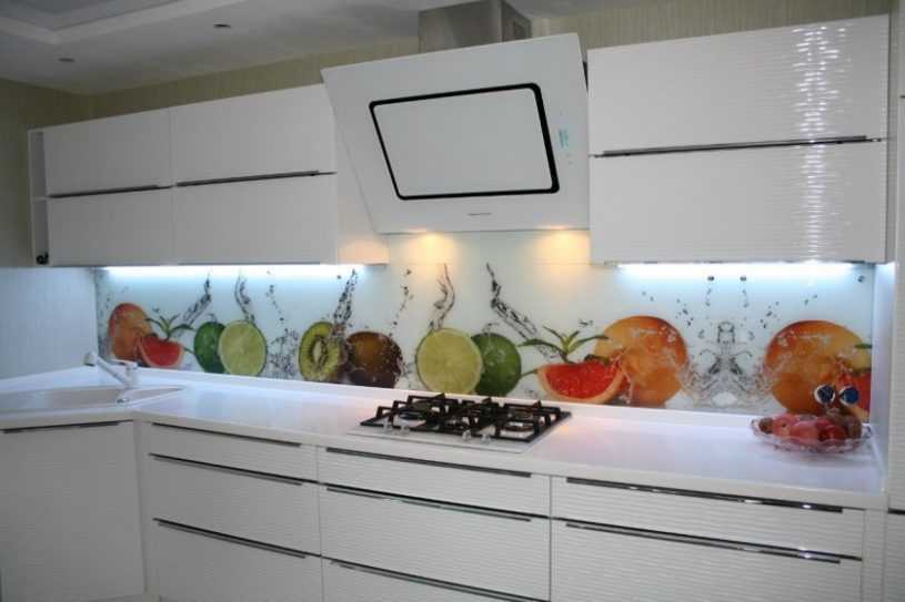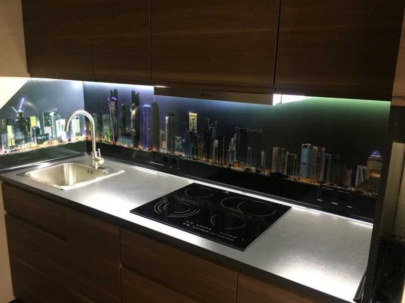 Стеклянный кухонный фартук как никакой другой сочетается с любой подсветкой.