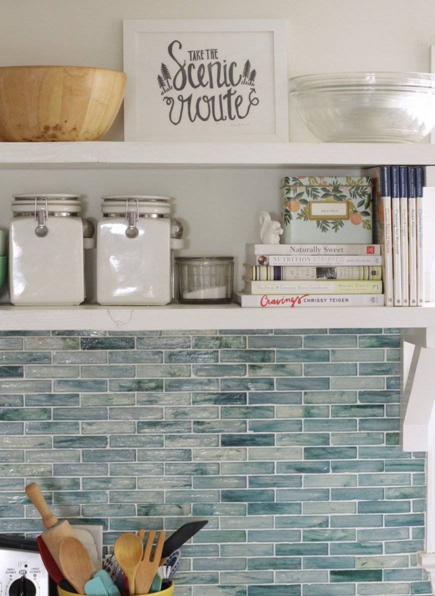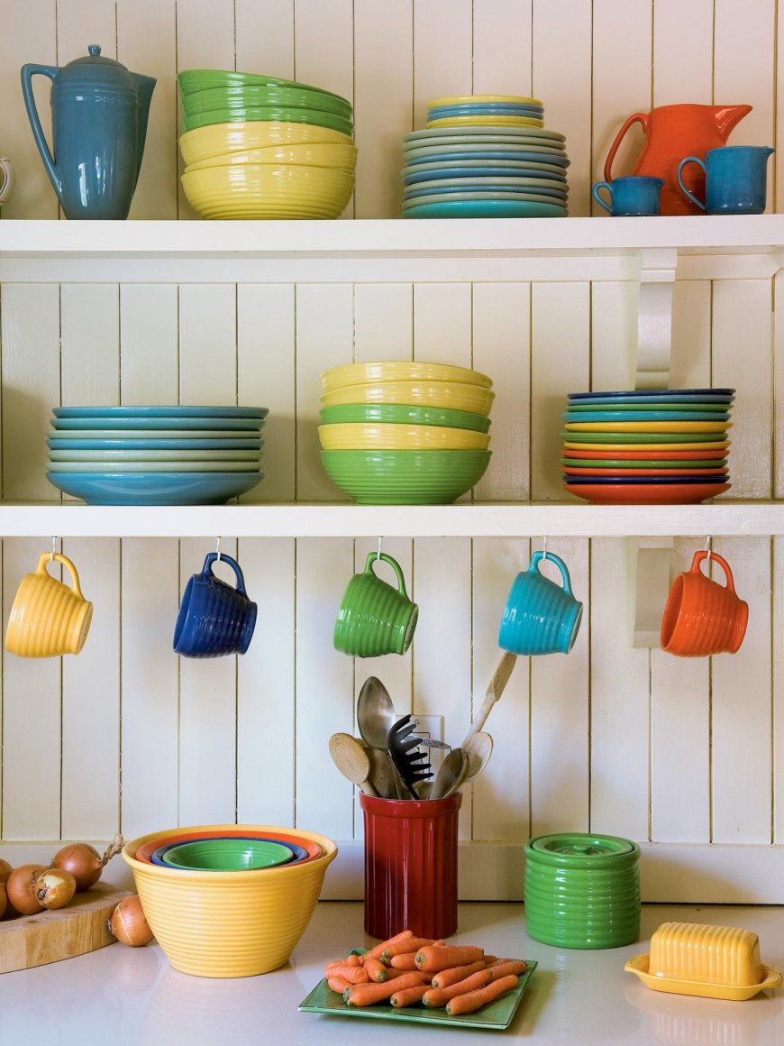 Если у вас уже есть старая, скажем, книжная полка, то ее легко можно обновить и переделать в кухонный стеллаж. Для этого ее нужно ошкурить, отшлифовать, прогрунтовать и покрасить в 2-3 слоя акриловой краской. А чтобы сделать вид полки интереснее, ее заднюю стенку можно оклеить обоями или покрасить в яркий цвет. Этот способ декора особенно актуален, если задняя стенка шкафа сделана из оргалита.