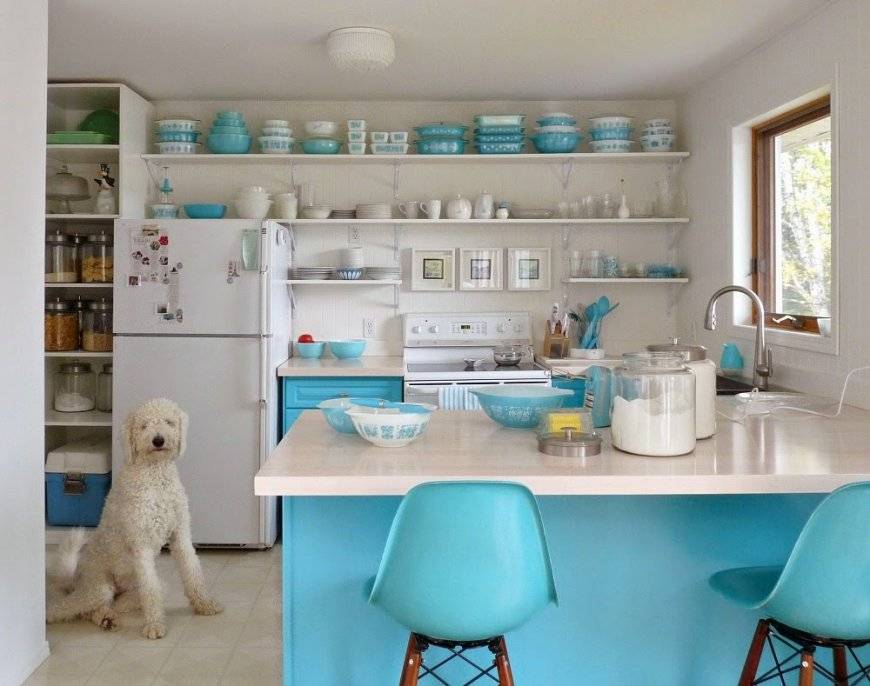 Стеллажи на маленькой кухне должны быть с такими полками, чтобы на них можно было ставить предметы не шире обеденной тарелки