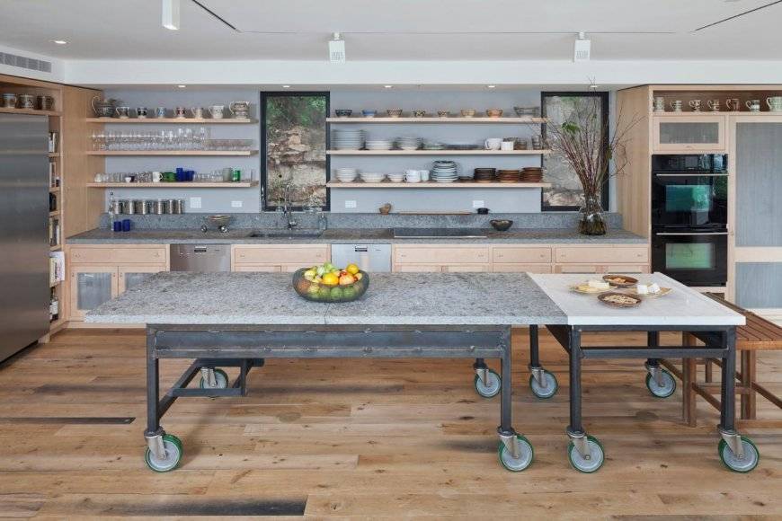 Стол стеллаж для кухни — модное решение со своими плюсами и минусами. К минусам можно отнести то, что его навряд ли удастся использовать как обеденный. Однако его возможно применять как фуршетный или раздаточный стол, стол для приготовления блюд и шкаф для хранения вещей.