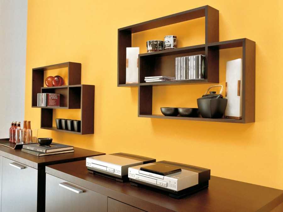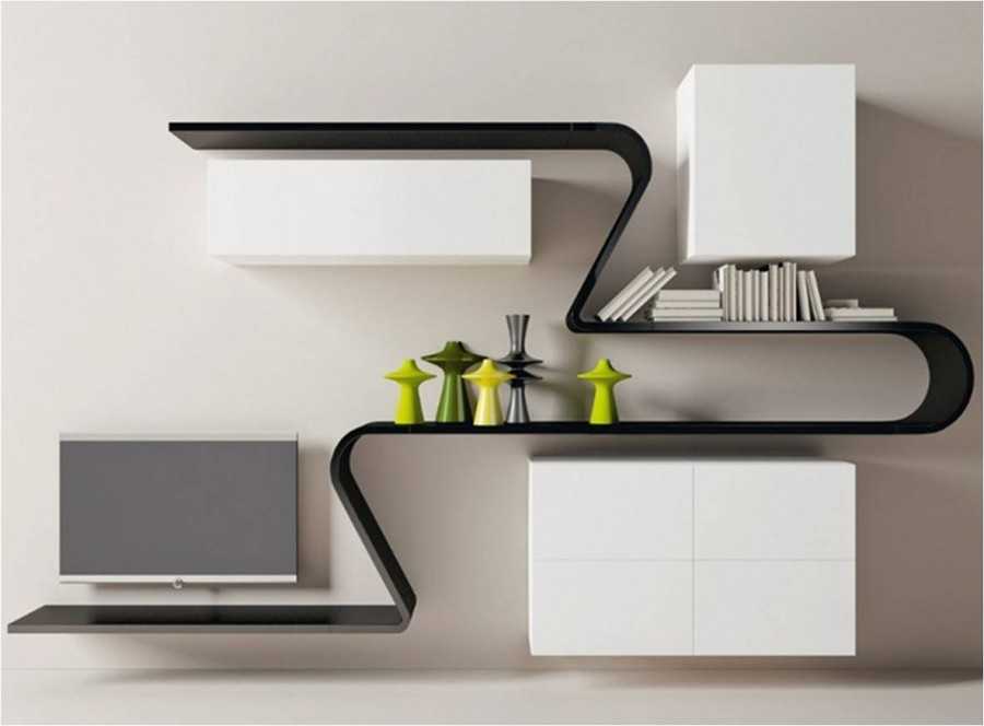 Также уместно рассмотреть и декоративные подвесные полки, которые не совсем функциональны, но эстетически приемлемые. Особый шарм в интерьер приносят стеллажи ассиметричной формы, принося интерьеру неповторимость и креатив.