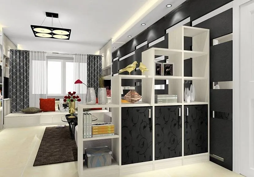 Вариантов размещения перегородки в комнате много, всё зависит от площади комнаты и разновидности конструкции. Объемные шкафы на всю стену больше подойдут для просторных помещений, небольшие стеллажи можно устанавливать в маленьких комнатах или квартирах-студиях.