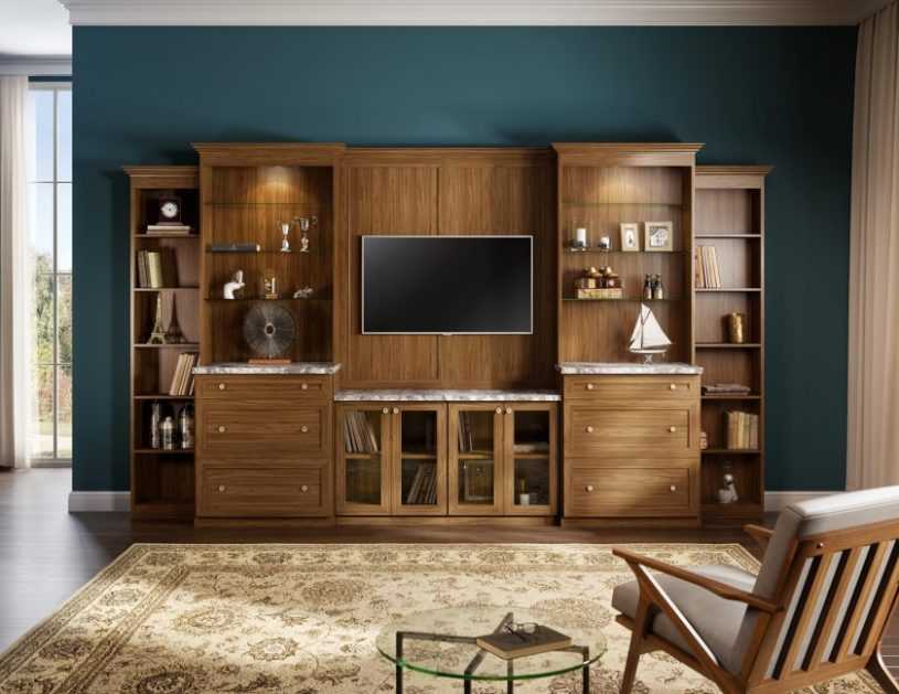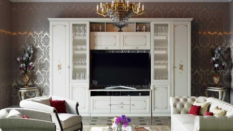 Классический вариант останется популярным, наверное, всегда. Чаще всего это стандартный набор, состоящий из секции для аппаратуры, платяных и книжно-посудных шкафов.