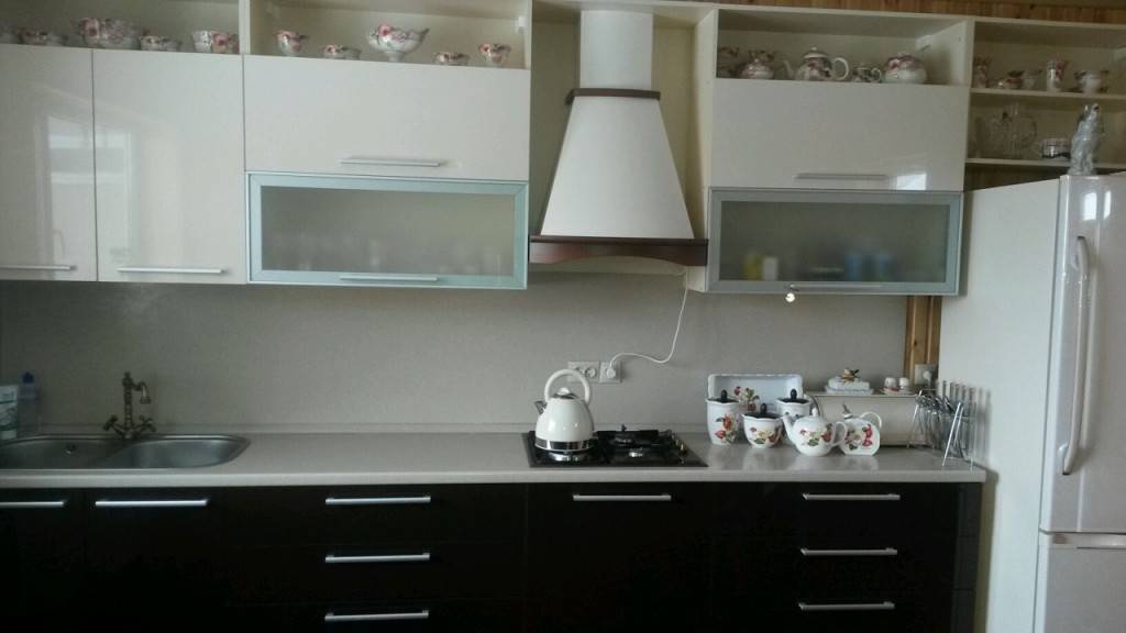 Фартук в таких кухнях может быть представлен в третьем цвете, например, в сером, оранжевом или красном. Такой вариант мебели выбирают те, кто хочет оформить свою комнату для приема пищи в неоклассическом стиле, в стилях модерн или хай-тек.
