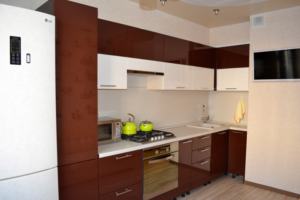 Пластиковые кухни в коричневом цвете будут красиво смотреться с белыми, бежевыми, оранжевыми, салатовыми стенами. Очень много производителей, работающих с коричневым цветом, предлагают комбинировать коричневый цвет нижних шкафов с, например, бежевыми/оранжевыми/салатовыми или белыми верхними шкафами.