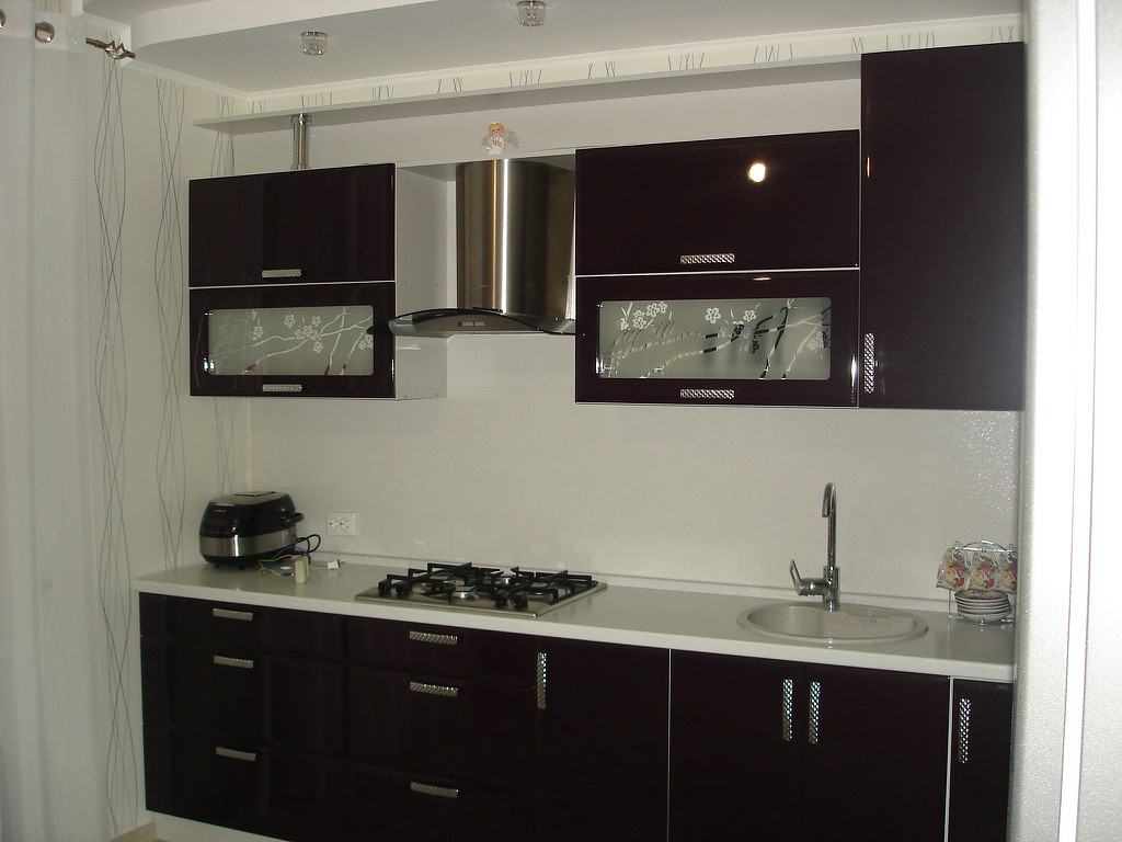 Стоит обратить внимание и на сочетание стилей: позолоченные завитки на дверцах или цветы на обоях будут странно выглядеть рядом с имитацией кирпичной кладки или видом ночного мегаполиса на МДФ