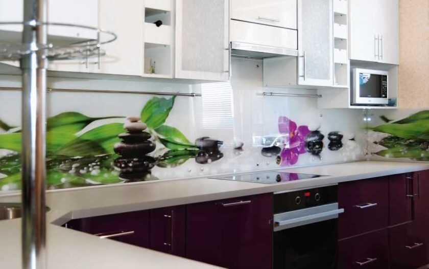 Стекло — это материал, который часто используют при создании фартука для кухни. Главное его достоинство — гигиена. На стеклянной рабочей поверхности нет швов и швов, а значит, ее легко чистить.