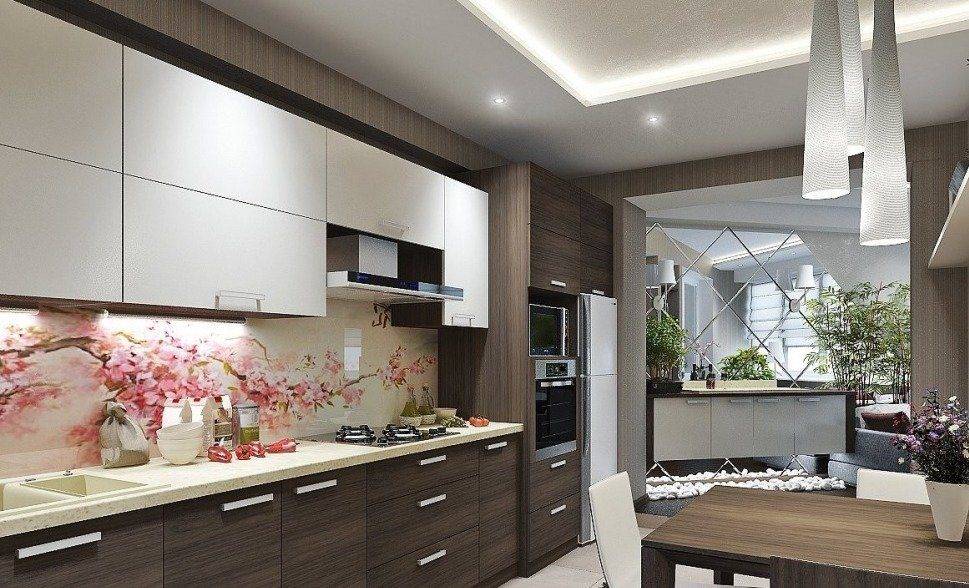 В создании дизайна кухни в японском стиле своими руками колористическая гамма играет важную роль. Ее соблюдение помогает обойтись минимальными затратами и аксессуарами при оформлении. Характерная особенность — отсутствие ярких красок, но в трансформированном виде допускаются фотообои с видами Японии, на которых может быть ярко-розовая сакура, Фудзияма на ослепительно изумрудном фоне или зеленые заросли бамбука.