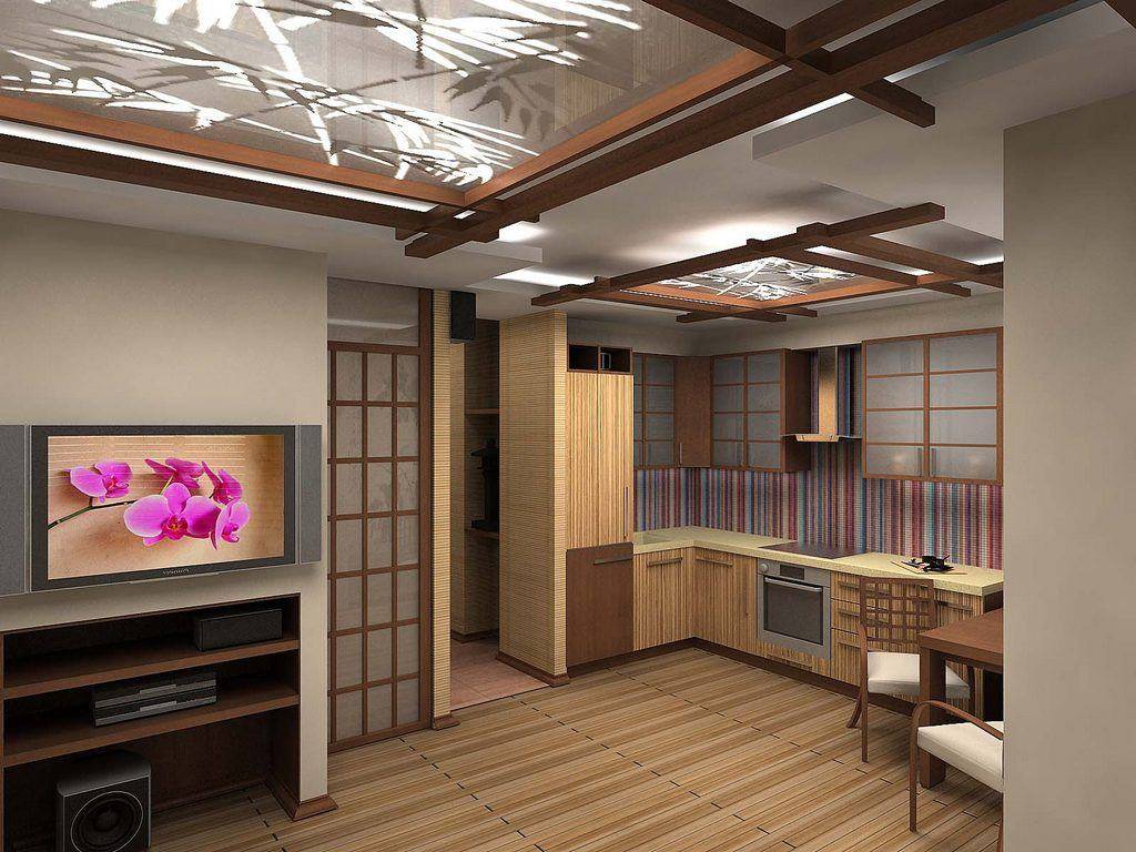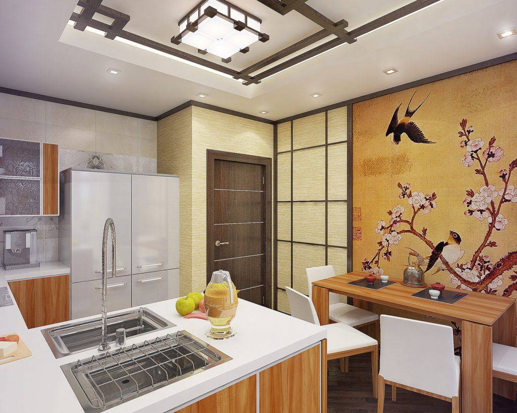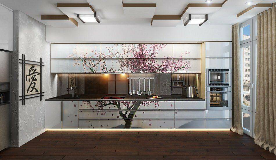 Японский стиль представляет для нас дополнительную задачу, а именно законченный дизайн кухни. Интерьер выполнен в японском стиле, где кухонная мебель простой симметричной формы, белого цвета, с деревянной столешницей и фасадами без ручек.