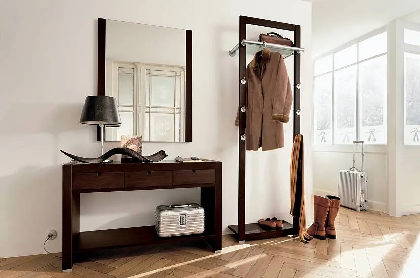 В маленьких прихожих или коридорчиках не всегда возможно установить шкаф-купе, а потому придется обойтись компактной вешалкой для одежды, стойкой для обуви и зеркалом. Если зеркало висит на стене, то под ним можно установить элегантную консоль для мелочей. Практичным дизайнерским решением могут стать большие зеркала от потолка до пола, которые сыграют на визуальное увеличение пространства.