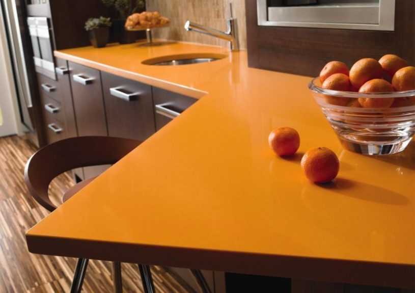 Столешница для кухни может быть в разных цветовых решениях. Обычно она повторяет по цвету фартук и в выгодном свете представляет кухонные фасады.