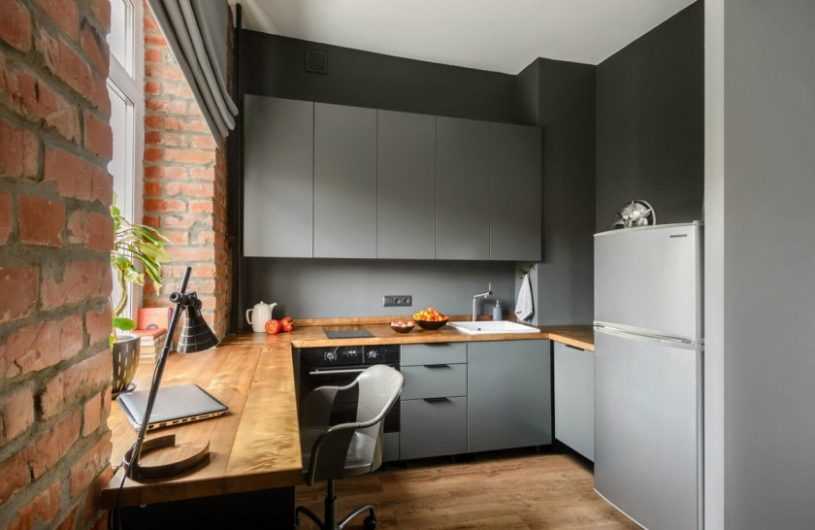 Черная столешница и цвета антрацит выглядит стильно. Подходит для кухни среднего размера и больше, визуально разделяет верхние пеналы и нижние шкафы гарнитура. Хорошо выглядит в любом стиле.