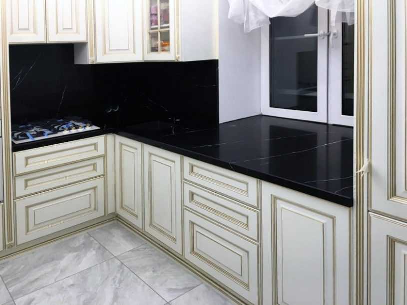 На фото черная глянцевая столешница в стиле интерьера современной классики выступает стильным акцентом и практичным решением.