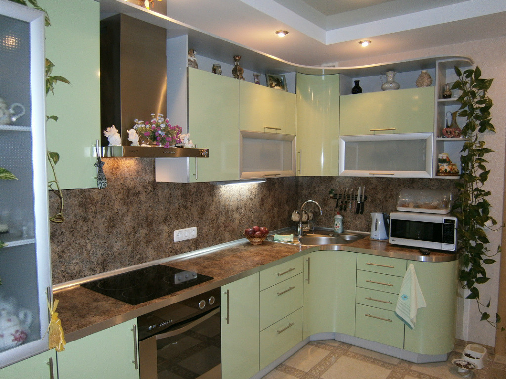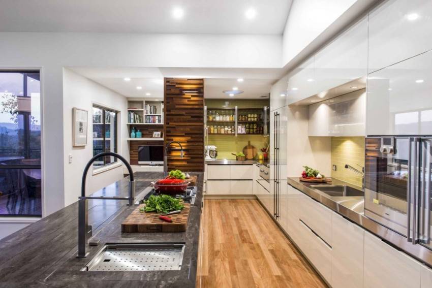 Для самых смелых контрастные решения. Например, синяя мойка в сочетании с синим потолком над зоной готовки. Для консерваторов есть более спокойные варианты, не менее яркие эффектные.