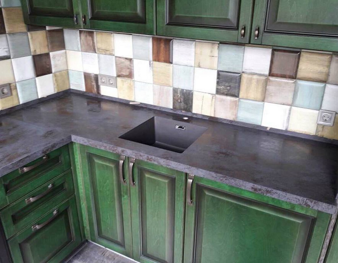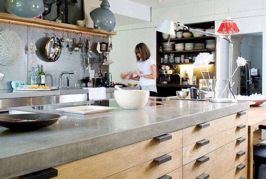 - Бетон. Чаще всего бетон применяют при капитальном ремонте. Но также при желании может получиться прекрасная бетонная столешница. Различные наполнители и добавки придадут ей красоту и грациозность.