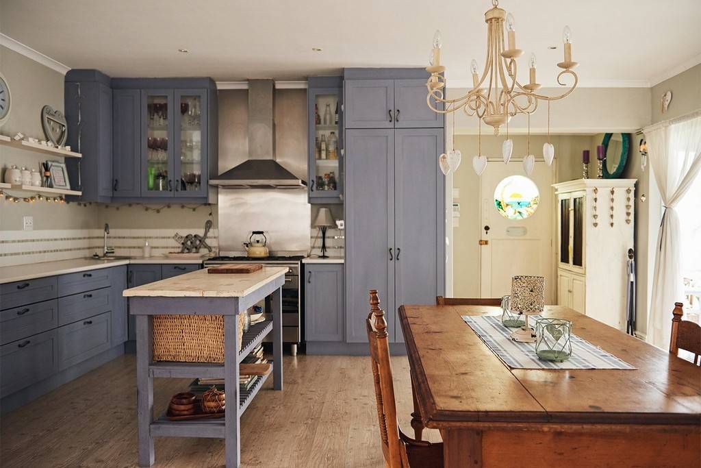 У лазурно-серого тона слабая интенсивность и очень холодная температура. В таких случаях помещение «утепляется» деревом. Можно сделать и наоборот: синий гарнитур с деревянной столешницей. Конечный баланс все равно будет обеспечен.