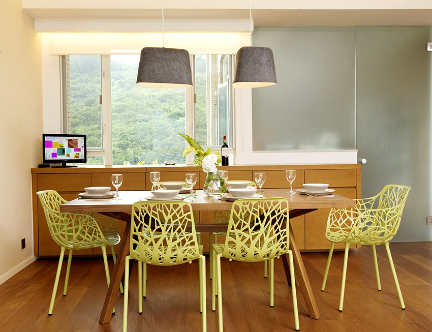 Овальный или круглый стол из стекла, металла или пластика исключит травмирование при проходе от одного ряда к другому. Прямоугольный – легко поместится в пространстве между рядами, выдвижная столешница пригодится при необходимости размещения для обеда или ужина гостей или всех членов семьи одновременно.