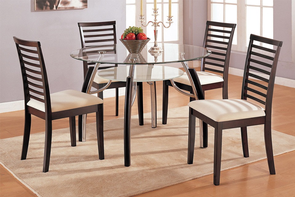 Очень необычны и привлекательны стеклянные обеденные столы. Ножки и рама выполняются из дерева и металла, а столешница — из прочного многослойного стекла. Особенно красиво смотрится тонированное или молочное стекло.