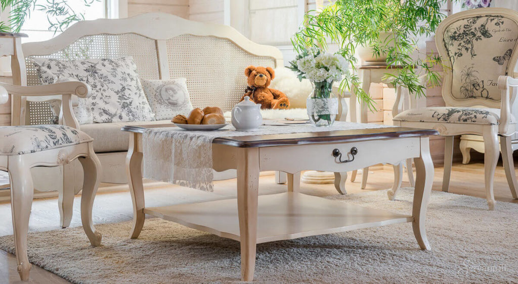 - Мебельный комплект в стиле прованс. Еще один деревянный образец. Но, в отличие от своих предшественников, столы и стулья, выполненные в таком стиле, имеют легкий налет старины.