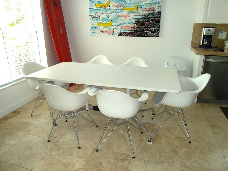 Кроме того, желательно, чтобы обивка была выполнена в темных тонах из ткани легкой моющейся текстуры. Таким образом, если она загрязнится, справиться с пятнами будет намного проще. Однако специалисты настоятельно не рекомендуют чистить обеденные комплекты мебели самостоятельно. Лучше довериться специалисту, который уж точно не испортит изделие и сможет придать ему первозданный вид.
