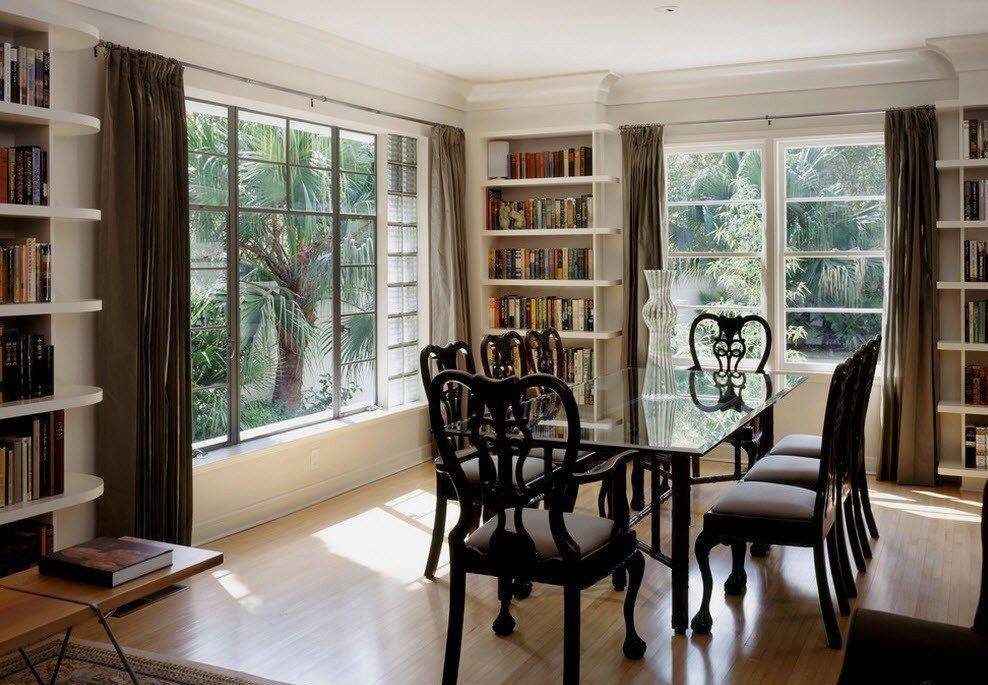 Сочетание украшений, перенятых от разных видов, способно воплотить в жизнь неоклассику. Широкие оконные проемы обеспечивают ярким светом. Позолоченные узоры на обоях стен, отражающиеся бликами на солнце. Богато расшитая мягкая мебель, увенчанная легкими грациозными складками, придаст эксцентричности. Дорогие, роскошные портьеры, снисходящие от потолка к самому полу, опоясанные пышными подхватами уберегут вас от яркого света. Высокие светлые колоннады, удерживающие эркер изнутри помещения, выполненные в лучших традициях греческих и римских потомков архитекторов, идеально выделят принадлежность такого оформления.