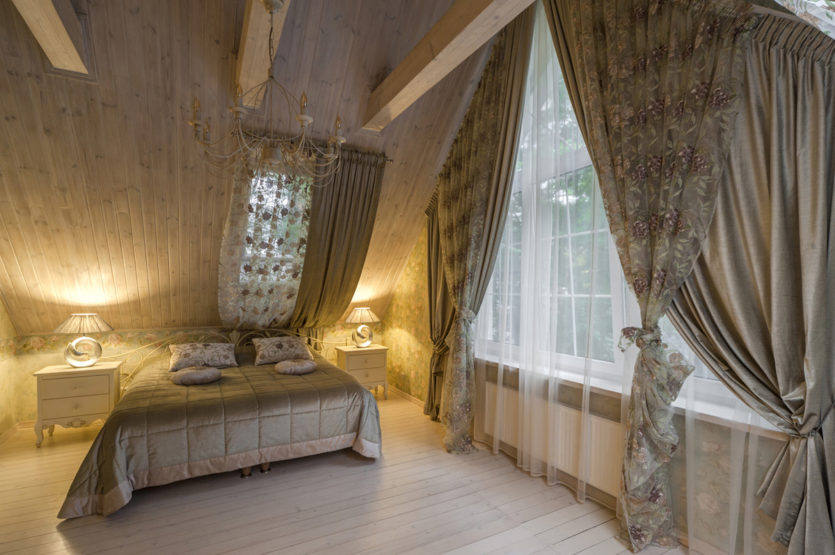 Портьеры из плотных тканей обязательны, что важно для полной изоляции от внешнего мира для полноценного сна. Идеально, если портьеры цветом или рисунком перекликаются с текстилем в комнате, создавая единую композицию