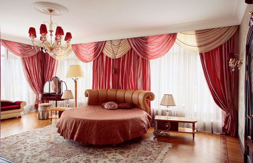 Модерн диктует изобилие драпировок на ткани. Если нет вкуса, то можно красоту превратить в загромождение материи, чем можно утяжелить весь интерьер спальни.