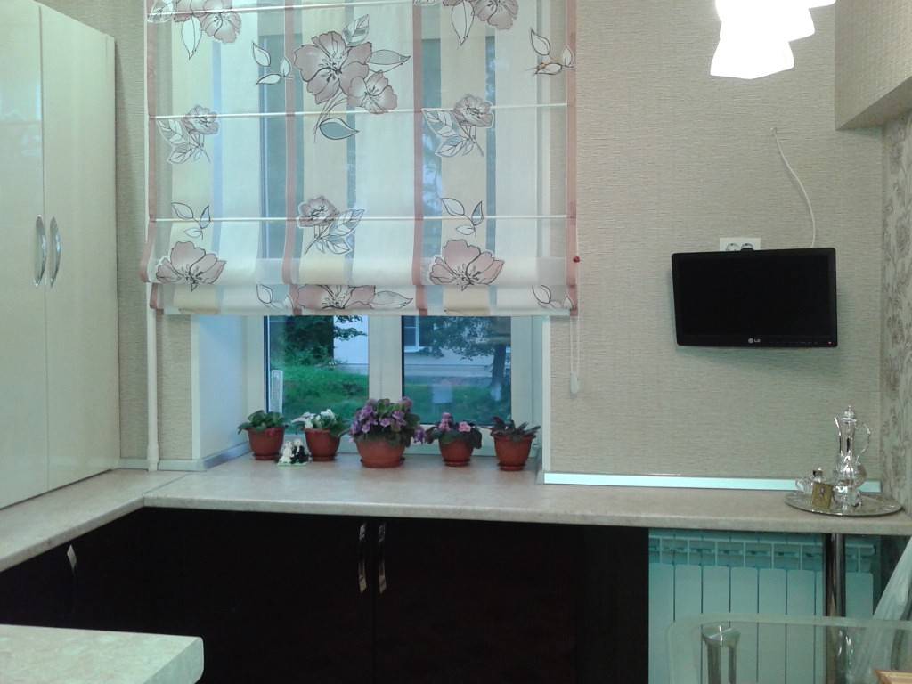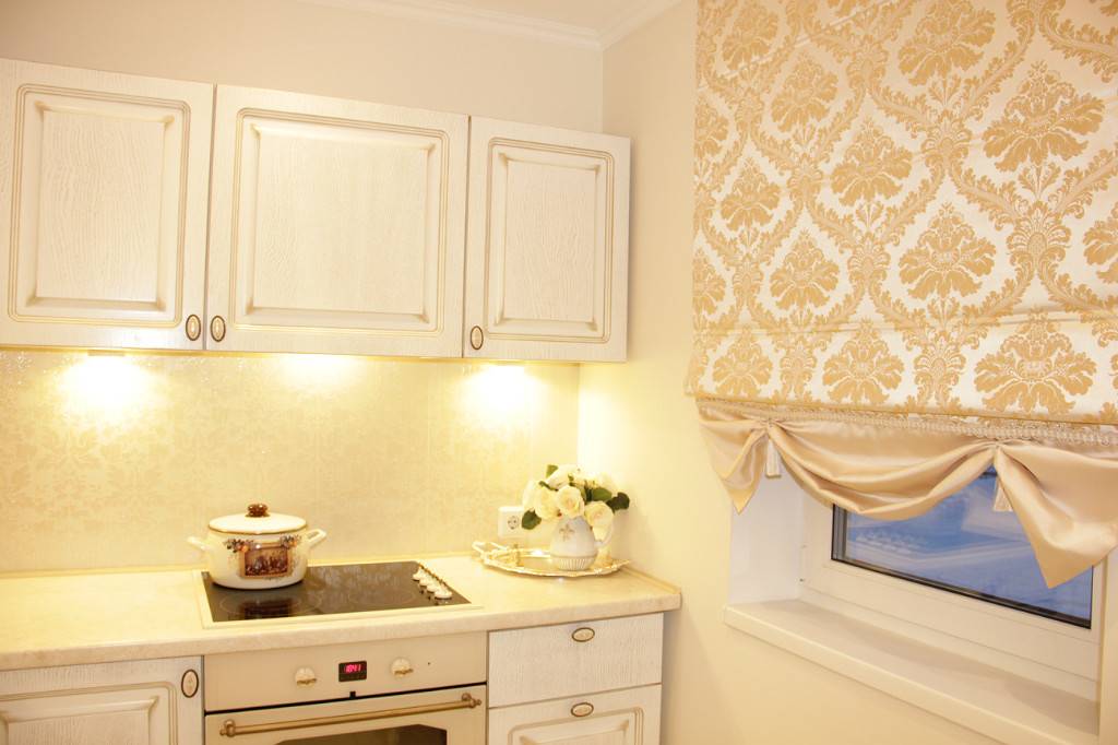 Не следует заваливать пространство сложными каскадами и придавать вычурность, используя ламбрекены. Идеальным решением будут римские шторы или обычные классические. Так как в маленькой кухне любое пространство заполняется разными деталями, то лучше вешать короткие шторы. Так будет свободный доступ к подоконнику.