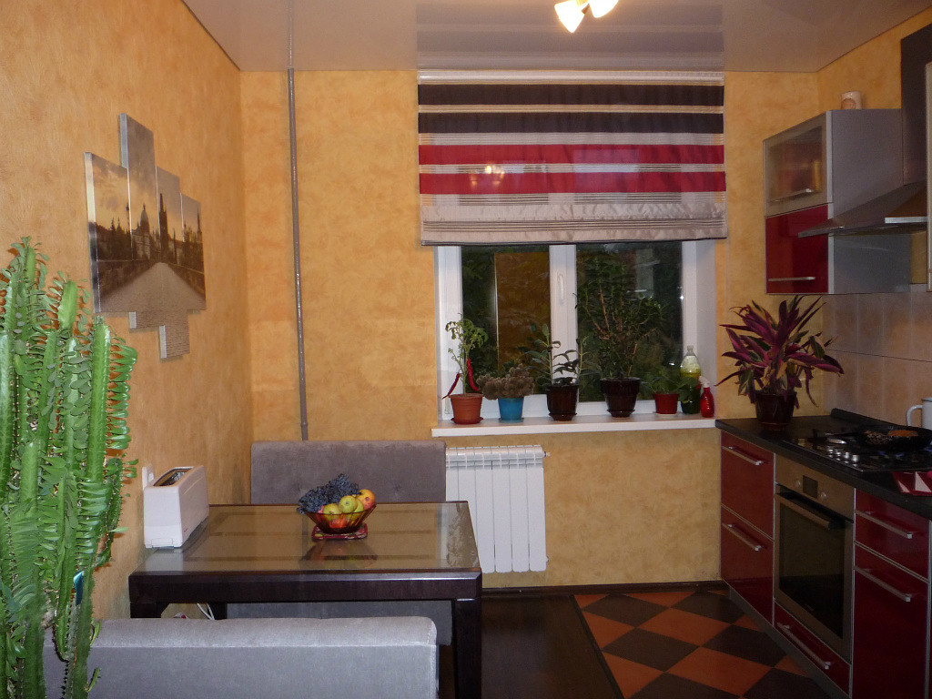 Короткие шторы. Очень практичны для кухни. Обладают такими преимуществами, как: не закрывают подоконник (тем самым освобождая дополнительное пространство), просты в уходе, широкий ассортимент и цветовая гамма. Легко снимаются и стираются.