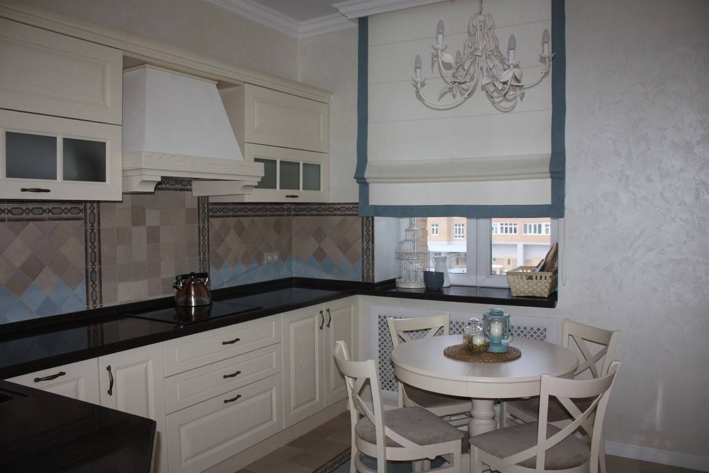 Для уже сложившего интерьера с декоративными излишествами можно подобрать тонкие простые занавески с элегантными драпировками из тюля или органзы. Чтобы сделать декор более выразительным, можно его дополнить ламбрекенами и подхватами. Ламбрекены, кстати, на классической кухне могут быть сколько угодно сложными — они не мешают функциональности кухни, а помещение приобретет роскошный, соответствующий выбранному стилю вид.