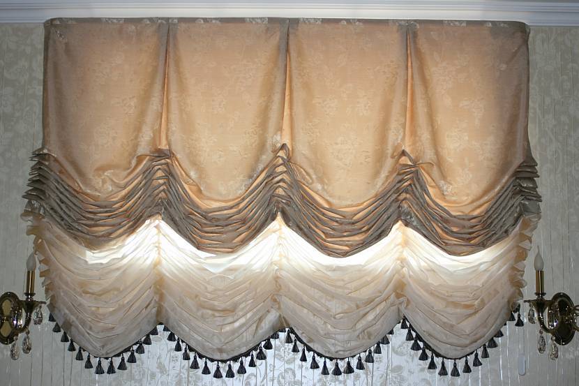 В расправленном виде они представляют собой одно сплошное полотно. При подъеме снизу у него формируются фестоны – дуговые складки, похожие на тяжелые фалды. Для большей декоративности подобное обрамление украшается тяжелыми шнурами с пушистыми кистями. Они проходят сквозь специальные кольца (или петли), крепятся вертикальными полосами с изнаночной стороны изделия. Количество таких элементов определяет число фестонов.