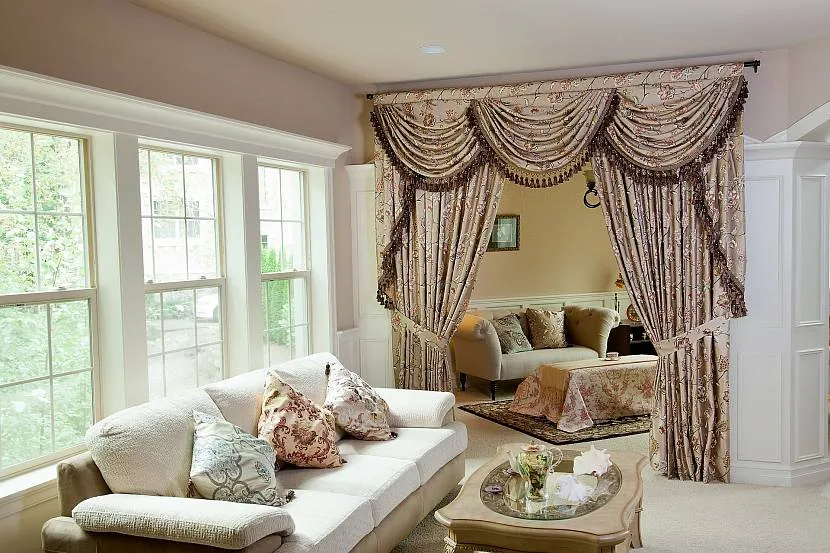 Французские шторы являются элегантным украшением окна и элементом стиля прованс. Занавеси такого типа идеально подойдут для гостиных с арочными окнами. Их главная особенность – множество наворотов, создающих утонченную, впечатляющую и элегантную атмосферу.
