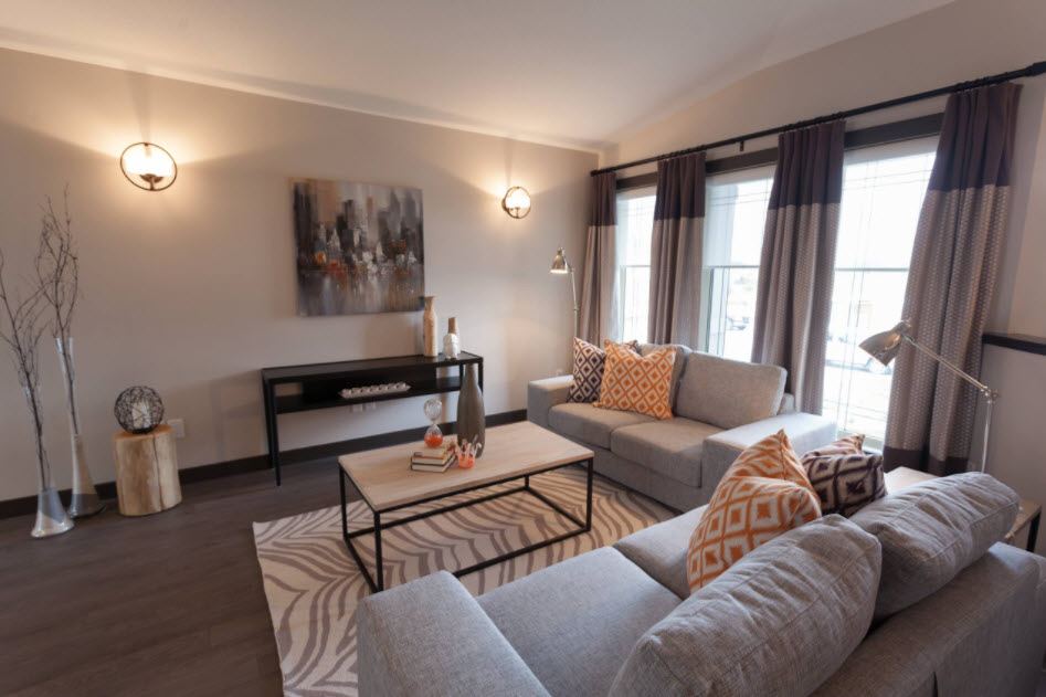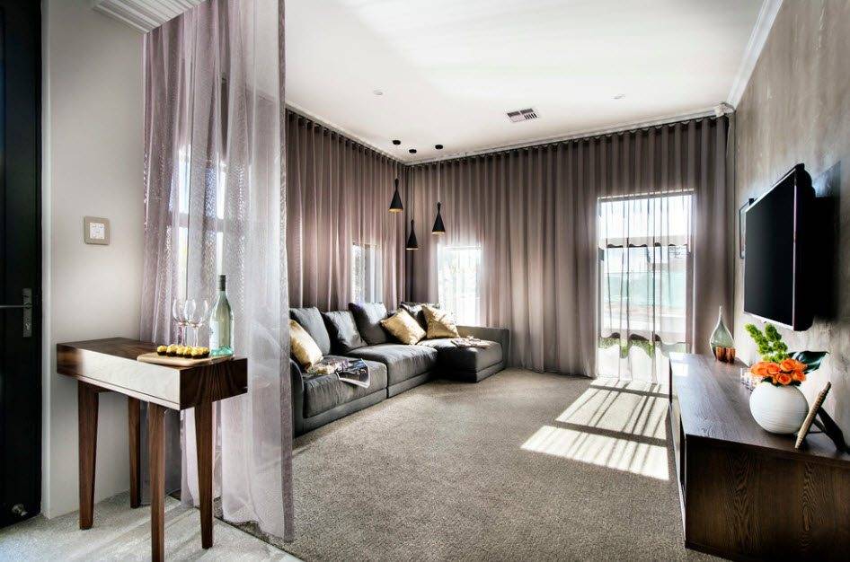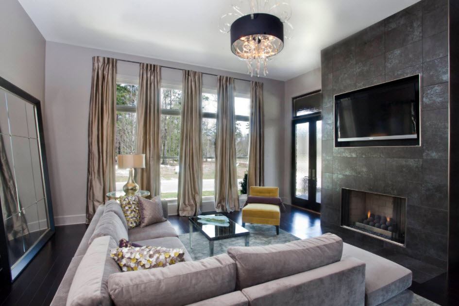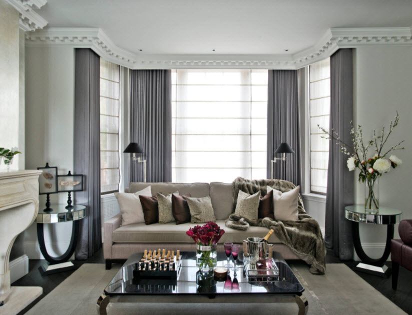 Оттенки серого рекомендуется выбирать с особой тщательностью, так как в зависимости от насыщенности штор будет восприниматься и интерьер гостиной.